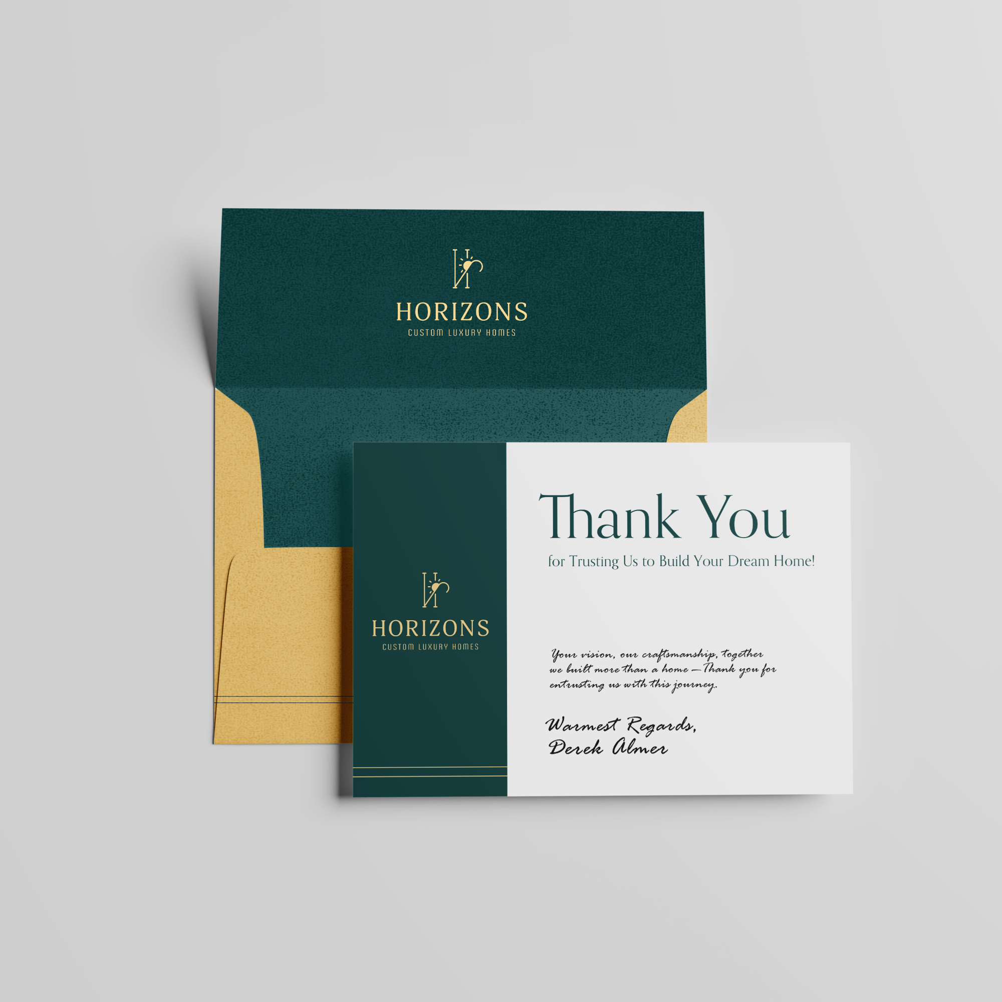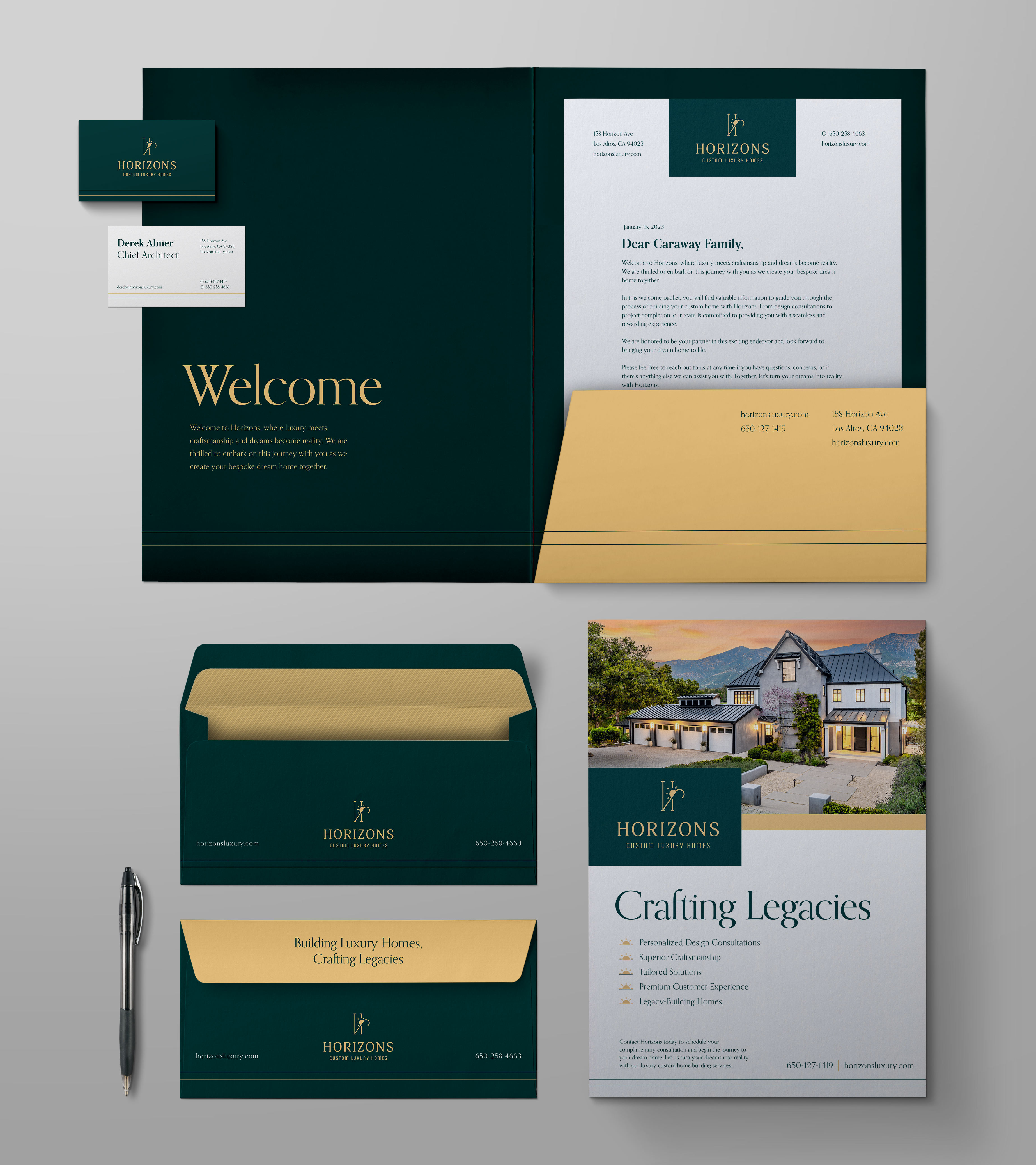The Horizon Custom Luxury Homes brand identity embodies the essence of luxury living, where architectural design meets aspiration and optimism. To speak to an affluent audience and client base, the goal of the visual identity was to reflect feelings of opulence, trust and sophistication.